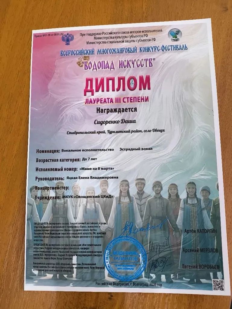 С радостью сообщаем, что Сидоренко Даша стала лауреатом 3-й степени во Всероссийском многожанровом конкурсе-фестивале «Водопад искусств»!
